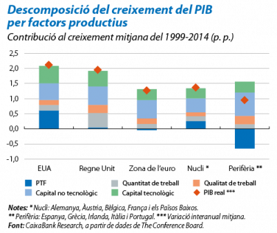 Per tant, el diferencial del creixement de la zona de l'euro en relació amb els EUA es pot explicar, principalment, per un menor creixement de la productivitat total dels factors i, en menor mesura, per la menor contribució del capital tecnològic (vegeu el segon gràfic). L'evolució de la quantitat de treball en el període precrisi va contenir les diferències en el creixement del PIB causades per la PTF i pel capital tecnològic, però, des del 2007, i, en especial, a la perifèria, la destrucció massiva d'ocupació va incrementar aquest diferencial.