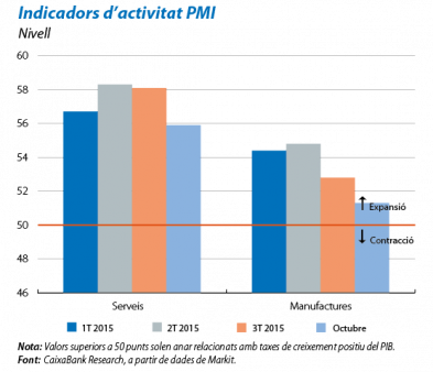 Els indicadors mostren que els serveis continuen al capdavant i que el bon to de la indústria es manté en el 4T. L'índex de sentiment empresarial (PMI) compost va pujar lleugerament a l'octubre, fins als 55,0 punts, en relació amb els 54,6 del setembre. L'avanç del sector serveis va compensar la lleugera moderació de l'índex manufacturer. Malgrat que els registres de l'octubre són una mica inferiors a la mitjana del 3T, els dos índexs (manufactures i serveis) es troben en una còmoda zona expansiva, de manera que esperem que el ritme de creixement continuï sent elevat en el 4T. Les perspectives per a la indústria són favorables, gràcies a la millora de l'activitat de la zona de l'euro. Aquest fet s'observa, per exemple, en les comandes industrials del setembre: les procedents de la zona de l'euro van avançar de forma significativa, el 6,5% interanual; en canvi, la resta de comandes de l'exterior van créixer un contingut 2,0% interanual.
