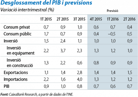 El ritme d'avanç de l'economia espanyola continua sent robust en l'últim tram de l'any. Després de la lleugera desacceleració de la taxa de creixement intertrimestral del 3T, fins al 0,8% (en el 2T va ser de l'1,0%), els indicadors recents són millors del que s'esperava i fan pensar que el ritme es mantindrà en el 4T. L'augment del poder adquisitiu de les llars, gràcies a la creació d'ocupació i al descens dels preus de l'energia, permet que el consum continuï sent ferm. A més a més, l'increment del crèdit corrobora que els estímuls monetaris tenen l'efecte desitjat. La depreciació de l'euro, a causa de la divergència entre la política monetària del BCE i de la Fed, contribueix també a augmentar les exportacions, malgrat la lleugera desacceleració de l'economia mundial. De cara al 2016, el PIB continuarà creixent en cotes elevades, malgrat que una mica inferiors a les de l'any anterior, de l'ordre del 0,6% intertrimestral, la qual cosa comporta una taxa anual del 2,7%, en relació amb el 3,1% del 2015 (vegeu l'article «La recuperació a Espanya: un salt qualitatiu» del Dossier).