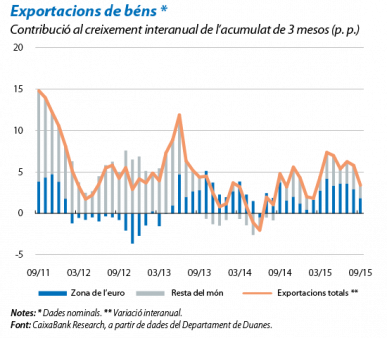 La demanda interna: el principal motor del creixement. El desglossament del PIB pel costat de la demanda mostra que la demanda interna va contribuir en 1 p. p. al creixement intertrimestral en el 3T, gràcies al dinamisme del consum privat i del públic. Malgrat que el bon to de la inversió en equipament es va mantenir, la inversió en construcció es va contenir després del repunt dels primers trimestres de l'any. L'increment de la demanda interna va empènyer a l'alça les importacions, de manera que, malgrat el notable increment de les exportacions, la demanda externa va restar al creixement del PIB (–0,2 p. p.). De cara als pròxims mesos, però, esperem que les importacions es desaccelerin quan el consum i la inversió perdin una mica de força. D'aquesta manera, el 2016, el sector exterior passarà a aportar positivament a l'avanç del PIB i la demanda interna cedirà una part del seu protagonisme.