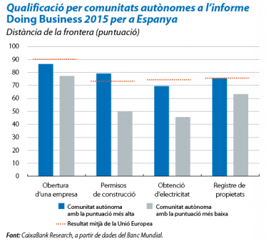 Ampli marge de millora per a la facilitat de fer negocis. Segons l'informe Doing Business 2015 per a Espanya, la majoria de comunitats autònomes es troben en una posició inferior a la mitjana de la Unió Europea en els quatre criteris avaluats: obertura d'una empresa, obtenció de permisos de construcció, obtenció d'electricitat i registre de propietats. Hi ha una gran heterogeneïtat en l'eficiència reguladora entre regions, i caldria replicar les bones pràctiques de les més ben posicionades. Algunes de les recomanacions que es desprenen d'aquest informe serien, entre d'altres, la necessitat de consolidar i eliminar tràmits per iniciar un negoci, la disminució dels costos d'electricitat i l'extensió de la tramitació telemàtica per agilitar els processos.