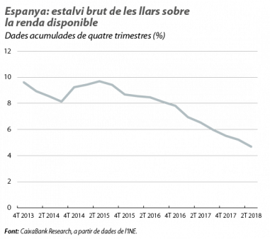 L’estalvi es manté en taxes baixes i els salaris creixen amb força. En concret, la taxa d’estalvi de les llars es va situar en el 4,7% en el 2T 2018 (acumulat de quatre trimestres), 0,5 p. p. per sota del registre del trimestre anterior. Aquesta disminució va reflectir una divergència entre el consum nominal, que va mantenir un creixement al voltant del 4% en el segon trimestre de l’any, i la renda bruta disponible (RBD), amb un avanç de l’1,9%. Així i tot, de cara als propers trimestres, preveiem que la taxa d’estalvi s’estabilitzarà gràcies a la recuperació del mercat laboral. Una mostra d’això és que el component més important de l’RBD, les rendes salarials, va créixer a un ritme similar al del consum nominal (el 3,8% interanual en el 2T 2018), la qual cosa suggereix que altres components més volàtils serien els responsables temporals del menor creixement de l’RBD.
