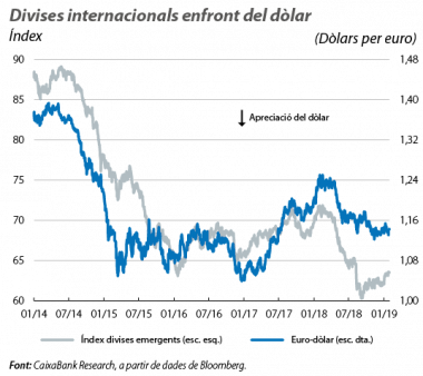 Les borses comencen l’any en positiu. La millora del sentiment inversor, juntament amb la publicació d’uns beneficis empresarials del 4T 2018 raonablement positius (en especial als EUA), va empènyer a l’alça i de manera generalitzada els principals índexs borsaris internacionals al gener. Així, als EUA, l’índex S&P 500 va avançar gairebé el 8% en el conjunt del mes; en canvi, als principals parquets de la zona de l’euro, els guanys es van situar al voltant del 6% (Eurostoxx 50, +5,3%; DAX, +5,8%; CAC, +5,5%; Ibex 35, +6,1%, i PSI 20, +8,4%). Les borses de les economies emergents també van registrar avanços importants (índex MSCI per al conjunt del bloc, +8,7%), en especial a l’Amèrica Llatina (índex MSCI de l’Amèrica Llatina, +14,9%), on va destacar l’auge de la borsa del Brasil (índex Bovespa, +10,8%), i a les economies asiàtiques (índex MSCI de l’Àsia emergent, +7,3%).