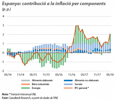 La inflació repunta pels preus energètics. La inflació general va pujar 1 p. p. al maig, fins al 2,1%, i va avançar fins al 2,3% al juny. Els indicadors suggereixen que l’augment va ser degut, especialment, a l’increment dels preus energètics, tot i que encara no es coneix el detall per components del juny. Per la seva banda, la inflació subjacent es va incrementar en 3 dècimes al maig, fins a l’1,1%, per l’encariment dels paquets turístics. De cara als propers mesos, l’evolució del preu del petroli continuarà pressionant els preus a l’alça, malgrat que esperem una certa moderació en l’últim terç del 2018. Així mateix, cal destacar que la inflació subjacent, que és la que marca les tendències a mitjà i a llarg termini, continua inscrita en registres moderats. La previsió d’inflació de CaixaBank Research per a la mitjana del 2018 puja de l’1,6% a l’1,8%, sobretot per l’augment de la repercussió de l’electricitat, dels aliments no elaborats i dels paquets turístics.