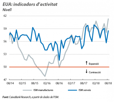 Els indicadors continuen apuntant a un creixement sòlid. En particular, després de la bona dada de creixement del PIB del 2T (de l’1,0% intertrimestral i del 2,9% interanual), els indicadors disponibles per al 3T –alguns dels quals han estat més alts del que s’esperava– confirmen que l’economia nord-americana manté un avanç dinàmic. A tall d’exemple, els models de previsió de Nowcasting del PIB de la Reserva Federal d’Atlanta i de la de Nova York prediuen un ritme d’activitat per al 3T molt per damunt del creixement potencial de l’economia nord-americana (que situem a la vora del 2%). Així mateix, els índexs de sentiment empresarial (ISM) de manufactures i serveis van augmentar de forma notable a l’agost i es van situar en els 61,3 i en els 58,5 punts, respectivament, molt per damunt del nivell que limita la zona expansiva de la recessiva (50 punts).