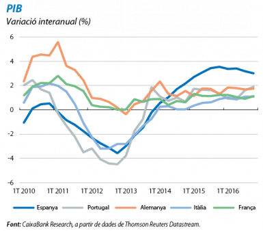 La recuperació econòmica s’ha estès a un major nombre de països. Eurostat va confirmar que el ritme de creixement del PIB de la zona de l’euro en el 4T va ser del 0,4% intertrimestral, el mateix que en el trimestre anterior. Amb aquesta dada, el creixement del PIB per al conjunt del 2016 es va situar en l’1,7%. Per països, destaca en positiu el fort avanç d’Espanya (el 0,7% intertrimestral, el mateix registre que en el 3T) i de Portugal (el 0,6%, 5 dècimes per damunt de la mitjana del 1T al 3T). Per la seva banda, França i Alemanya van créixer el 0,4% intertrimestral en el 4T, un registre 2 i 3 dècimes superior al del trimestre anterior, respectivament. En canvi, Itàlia va continuar mostrant un ritme de creixement feble (del 0,2% intertrimestral). Per als propers trimestres, esperem que el creixement al conjunt de la zona de l’euro es mantingui en un ritme similar, entre el 0,4% i el 0,5% intertrimestral.