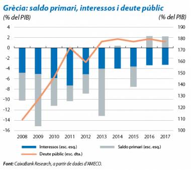 La recuperació grega no avança i la saga del rescat obre un nou capítol. L’economia grega va tornar a créixer el 2016, després de la reculada del 2015. No obstant això, el creixement es manté feble (el 0,3% el 2016) i el PIB se situa encara el 26% per sota del nivell precrisi. D’altra banda, encara no s’ha arribat a un acord per al desemborsament dels propers pagaments previstos al tercer programa de rescat (aprovat a l’estiu del 2015). Un primer pas en aquesta direcció ha estat la decisió que les diferents institucions implicades (Comissió Europea, BCE, FMI i MEDE) tornin a Atenes per negociar un paquet addicional de reformes estructurals centrat en la millora del sistema impositiu, de la regulació del mercat laboral i de les pensions. En aquest sentit, la correcta implementació de les reformes que s’acordin serà fonamental per augmentar el creixement de l’economia grega i per assegurar la sostenibilitat del deute públic.