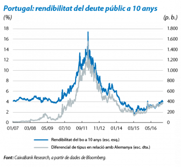 Milloren les perspectives econòmiques a Portugal. L’economia portuguesa va créixer a un ritme superior a l’esperat pel conjunt d’analistes en el 4T 2016 (el 2,0% interanual, enfront de l’1,6% previst), amb el suport del bon to de la demanda interna, en especial la inversió, i de les exportacions. Així i tot, el creixement per al conjunt del 2016 es va situar en l’1,4%. En els propers trimestres, s’espera que l’economia continuï avançant a un ritme semblant. Així ho reflecteixen les previsions del consens d’analistes, que apunten a un creixement de l’1,5% el 2017 i de l’1,4% el 2018 (igual que l’escenari de CaixaBank Research). Malgrat tot, els costos de finançament del país lusità es mantenen elevats. D’una banda, això és degut a la preocupació dels inversors per la situació de la banca i de les finances públiques. A aquests riscos idiosincràtics s’ha sumat, recentment, la incertesa política que plana sobre el conjunt de la zona de l’euro, que esperem que s’esvaeixi al llarg del 2017. En relació amb la situació de la banca, en els últims mesos, s’han fet avanços considerables perquè s’esvaeixi la incertesa sobre la situació del sector, la qual cosa propiciarà que la prima de risc iniciï una tendència a la baixa. Pel que fa a la situació de les finances públiques, tot fa pensar que el dèficit pressupostari del 2016 s’haurà situat per sota del 3% del PIB, de manera que Portugal sortirà del procediment de dèficit excessiu que té obert amb la Comissió Europea. De fet, la Comissió ja ha revisat a la baixa les previsions de dèficit públic per al 2016 del 2,7% del PIB fins al 2,3%. No obstant això, el nivell de deute públic es manté elevat (al voltant del 130% del PIB), de manera que Portugal no pot abaixar la guàrdia.