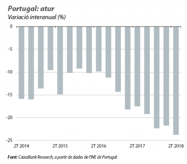 L’economia consolida el dinamisme. Les dades més recents confirmen que el creixement econòmic es manté robust, gràcies al bon to de la demanda interna i a les exportacions. Precisament, el dinamisme de la demanda domèstica (dins la qual destaquen la recuperació del consum de béns duradors i la inversió), sumat a un preu del petroli més alt i a l’alt contingut importador d’algunes exportacions (com els combustibles i els automòbils), alimenta un avanç significatiu de les importacions. Això, juntament amb la caiguda de les exportacions a Angola i al Regne Unit, explica una de les ombres del quadre macroeconòmic portuguès: la menor contribució neta al creixement per part del sector exterior. No obstant això, en conjunt, l’escenari de l’economia lusitana és positiu, i s’espera que, en els propers trimestres, mantingui el dinamisme dels primers sis mesos de l’any, amb un ritme d’avanç lleugerament superior al 2%, amb la contribució del bon funcionament del mercat laboral, on la creació d’ocupació i la reducció del nombre d’aturats continuen sorprenent en positiu, i de l’evolució positiva del mercat immobiliari, que es beneficia de la demanda estrangera i del creixement del turisme. No obstant això, els factors de risc, en especial els relacionats amb les tensions comercials, amb l’enduriment de les condicions financeres globals i amb les turbulències de les economies emergents, continuen presents i poden condicionar l’escenari.
