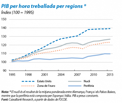 Si es descompon l’evolució de la productivitat a la zona de l’euro entre la dels països de la perifèria i la dels països core, es constaten tres tendències. Primera, l’evolució és molt heterogènia entre els països del nucli i els de la perifèria. Segona, als països core, com era d’esperar, la seva evolució ha estat una mica millor que la del conjunt de la zona de l’euro, però s’ha mantingut lluny de l’observada als EUA. I, tercer, als països de la perifèria europea, l’evolució de la productivitat ha estat molt pobra. En concret, el creixement anualitzat s’ha quedat en el 0,5%.