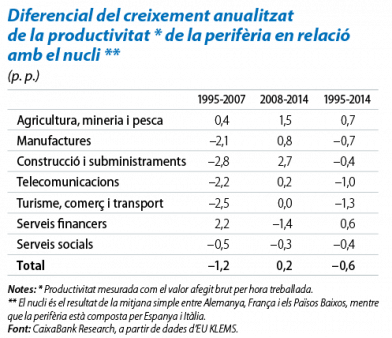 Finalment, pel que fa a l’evolució de la productivitat als països de la perifèria, la taula adjunta mostra que, entre el 1995 i el 2014, la productivitat a la perifèria va créixer, en termes anualitzats, 0,6 p. p. menys que als països del nucli. Aquest diferencial és particularment elevat als sectors de turisme, comerç i transport i telecomunicacions. No obstant això, cal destacar que, a partir de la crisi econòmica, s’observa un canvi de tendència remarcable. En concret, mentre que el diferencial de creixement de la productivitat entre els països de la perifèria i els core es va situar en –1,2 p. p. durant l’etapa prèvia a la crisi, en l’etapa posterior, el creixement de la productivitat va ser lleugerament superior a la perifèria europea. No obstant això, és massa aviat per cantar victòria, ja que una part d’aquesta millora de la productivitat és el resultat de la important destrucció d’ocupació que es va produir als països de la perifèria durant la crisi, i, per tant, caldrà seguir de prop si aquest canvi de tendència es manté en els anys de recuperació econòmica. Les reformes estructurals dutes a terme als països perifèrics conviden a un optimisme moderat.
