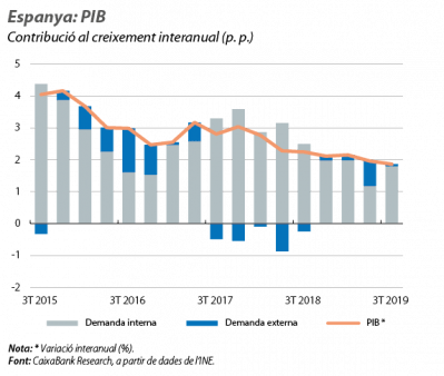Una moderació gradual del creixement. Amb les dades disponibles de tres dels quatre trimestres de l’any 2019 que acabem de tancar, tot fa preveure que el creixement de l’economia s’haurà situat el 2019 prop de l’1,9% anual, un ritme més contingut que el de l’any passat (el 2,4%), però clarament per damunt de la mitjana de creixement previst per a la zona de l’euro (l’1,1%). Aquesta moderació del creixement s’explica tant per l’esvaïment de l’impuls cíclic que ofereix la fase inicial de la recuperació econòmica com pel deteriorament de l’entorn comercial global. Aquest deteriorament, producte d’elements com el pols comercial entre els EUA i la Xina, les incerteses relacionades amb el brexit i les dificultats que travessa el sector de l’automòbil a nivell europeu (per la introducció de noves regulacions i pel canvi tecnològic que experimenta el sector), ha tingut un impacte sobre les exportacions espanyoles de béns i serveis pel canal de la demanda, però no és un senyal de pèrdua de la competitivitat en termes relatius. Així, la desacceleració que observem representa, en gran part, un procés de convergència del creixement cap a cotes més coherents amb el creixement potencial de l’economia. De cara a l’any vinent, preveiem que aquest procés de convergència tindrà continuïtat i que l’economia creixerà a taxes properes a l’1,5%.