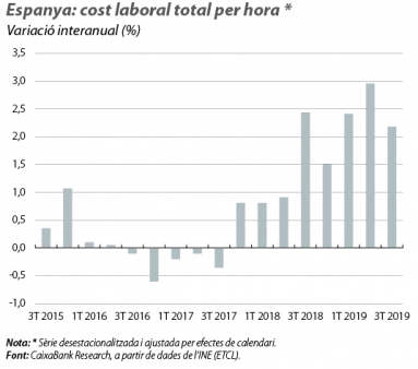 La desacceleració gradual del mercat laboral es dona un respir al novembre. En concret, l’afiliació a la Seguretat Social va augmentar el 2,3% interanual, el mateix ritme d’avanç que un mes enrere, tot i que per sota de l’experimentat al novembre del 2018 (el 2,9% interanual). D’aquesta manera, malgrat el context de desacceleració, el ritme de creació d’ocupació es manté robust i continuarà oferint suport al creixement dels ingressos i del consum. D’altra banda, es preveu que el creixement dels ingressos es basi cada vegada més en una recuperació gradual dels salaris, que les dades ja mostren des de fa diversos trimestres. Així, si el 2017 els salaris per hora efectiva de treball es van mantenir estancats (creixement del –0,1% anual), el 2018 van repuntar fins a l’1,5%, i, en el 3T 2019, el creixement es va accelerar fins a l’1,9% interanual.