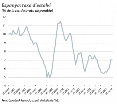 L’estalvi es manté estable en el 3T. El bon ritme d’avanç del creixement de l’ocupació i la recuperació dels salaris s’han vist reflectits en el creixement de la renda disponible bruta de les llars, que, en el 3T 2019, es va situar en el 4,2% interanual. Així mateix, el consum va créixer a una taxa notable, tot i que una mica més modesta del 2,6% interanual, de manera que la taxa d’estalvi es va situar en el 7,0% de la renda disponible bruta (acumulat de quatre trimestres), un registre 1,4 p. p. superior al del 3T 2018 i similar al registre del trimestre passat. Malgrat que la recuperació de la taxa d’estalvi dels mínims de l’any passat (el 5,5% en el punt mínim) ha comportat un creixement del consum menor, també és una millora dels matalassos financers de les llars, de manera que atorga més resiliència a l’economia.
