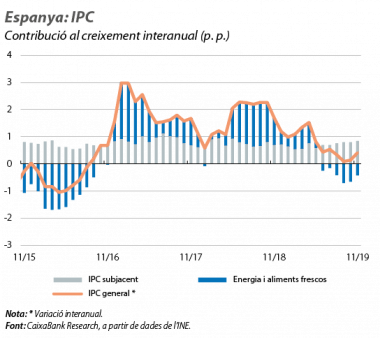 L’activitat manté el to en el tram final de l’any. L’evolució del conjunt dels indicadors al llarg de l’últim mes ha estat mixta. D’una banda, la confiança del consumidor al novembre va cedir 1,2 punts, fins als –10,3 punts, i la producció industrial a l’octubre va caure l’1,3% interanual (el +0,6% al setembre). En contraposició, tant el PMI de manufactures com el de serveis del novembre van registrar una lleugera millora i van pujar 0,7 i 0,5 punts, respectivament, fins als 47,5 i els 53,2 punts. Quan incorporem tot el conjunt d’indicadors en el model Nowcasting de projecció a curt termini del PIB, obtenim una previsió de creixement intertrimestral del 0,4% per al 4T 2019, un registre similar al del trimestre anterior. A més a més, aquesta taxa seria coherent amb la nostra previsió de creixement anual de l’1,9% per al 2019.