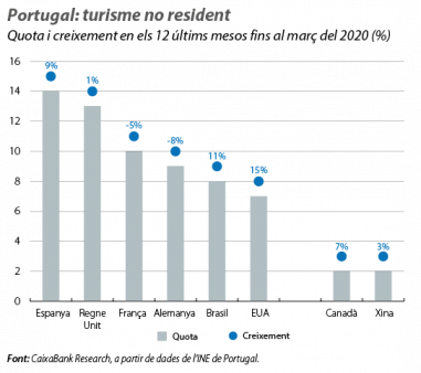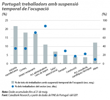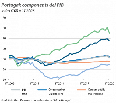 Fort impacte de la COVID-19 en el primer trimestre de l’any. El PIB es va contreure el 2,3% interanual (el –3,8% intertrimestral) en el 1T arran de les mesures de distanciament social, la qual cosa representa una contracció intertrimestral superior a la de la crisi financera. L’impacte negatiu sobre l’activitat va ser especialment intens en els 20 últims dies del mes de març, quan es va iniciar l’estat d’alarma a Portugal i les mesures de confinament van ser màximes. Així, dels agregats del 1T, es pot inferir que la caiguda de l’activitat va ser, aproximadament, el 25% en aquestes setmanes. En el detall per components del conjunt del trimestre, s’observa un fort impacte tant sobre la demanda interna com sobre l’externa. En concret, el consum de les llars va caure l’1,0% interanual (el –3,0% intertrimestral) i la inversió (formació bruta de capital), el 2,5% (la formació bruta de capital fix es va contreure el 0,3% interanual), mentre que el consum públic va avançar el 0,5%. En conjunt, la demanda interna va sostreure 1,1 p. p. al creixement interanual del PIB i 2,0 p. p. a l’intertrimestral. Per la seva banda, la demanda externa també va caure de forma clara, amb una contracció de les exportacions de béns i de serveis (el 7,1% intertrimestral i el 4,9% interanual) superior a la registrada per les importacions (el 3,1% intertrimestral i el 2,0% interanual).