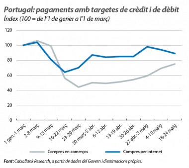 S’esperen descensos superiors en el 2T 2020, però, al maig, es va produir una recuperació incipient. Els indicadors més recents mostren una forta retracció de l’activitat a l’abril, provocada per la prolongació del confinament al llarg de tot el mes, de manera que, en el segon trimestre, s’hauran vist afectats per les restriccions de mobilitat més setmanes que en el 1T. En concret, els indicadors coincidents del Banc de Portugal per a l’activitat agregada i per al consum (fortament correlacionats amb el PIB i amb el consum) van caure fins al –1,7% i el –2,7% a l’abril, respectivament, de manera que es van intensificar els descensos del –0,9% i del –1,5% que ja havien registrat al març. Indicadors com el consum d’electricitat i de combustible són també indicatius del nivell de paràlisi de l’activitat a l’abril. Així, el consum d’electricitat en dies hàbils va caure el 13,8%; el de gasoil, el 46,9%, i el de benzina, el 58,4%. Les dades sobre els pagaments amb targetes de dèbit i de crèdit també reflecteixen una frenada del consum, ja que van caure gairebé el 38% a l’abril. Pel que fa al maig, els indicadors disponibles encara són limitats, però suggereixen una millora lleugera de l’activitat econòmica (per exemple, les vendes d’automòbils o els indicadors de mobilitat). En el mateix sentit, l’índex de compres amb targetes de crèdit i de dèbit es va recuperar fins als 75 punts (59 al final d’abril i mínim de 44 al final de març). No obstant això, el consum d’electricitat continua mostrant una reactivació feble, ja que la mitjana del consum diari en els 20 primers dies de desconfinament va ser l’1,8% inferior als 20 dies anteriors, malgrat que el percentatge d’empreses en funcionament va augmentar fins al 90%, en relació amb el 84% de la segona quinzena d’abril.