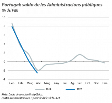 El saldo pressupostari va empitjorar arran de l’impacte de la pandèmia. A l’abril, el saldo es va situar en el –2,5% del PIB (acumulat des de l’inici d’enguany), la qual cosa representa un deteriorament en relació amb el –1,9% del mateix període del 2019. L’impacte de la COVID-19 sobre els comptes públics va ser especialment visible en l’ajornament d’ingressos (320 milions d’euros) i en l’augment significatiu d’algunes despeses, com les transferències corrents i l’adquisició de béns i de serveis. En conjunt, s’estima que ja es van executar despeses relacionades amb la COVID-19 per un total de 345 milions d’euros fins a l’abril (el 0,2% del PIB). En els propers mesos, l’impacte de les despeses relacionades amb les mesures de suport a l’economia es farà més visible a mesura que les ajudes es vagin implementant i, possiblement, ampliant.