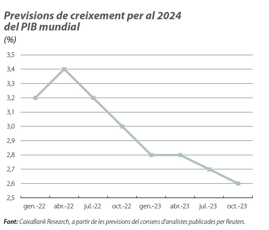 L’economia mundial encara el final del 2023 i l’inici del 2024 amb un refredament a velocitats desiguals, especialment intens a Europa, força suau als EUA i amb la Xina complint els objectius de creixement de les autoritats però embolicada en les dificultats del seu sector immobiliari. En aquest punt d’inflexió, l’economia mundial persegueix un aterratge suau que permetria reduir la inflació amb un cost assumible en termes de creixement, però ho fa en un entorn no exempt de riscos importants. En el pla geopolític, a la guerra a Ucraïna s’afegeix el conflicte entre Israel i Hamàs, mentre que, en l’àmbit més estrictament econòmic, la inflació encara té camí per davant per situar-se en els objectius dels bancs centrals, i, malgrat que sembla que l’enduriment de la política monetària ha tocat sostre, els seus efectes encara s’estan filtrant.