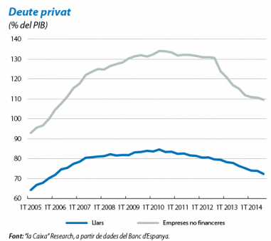 El despalanquejament del sector privat prossegueix, malgrat que ho fa lentament. El deute de les famílies i de les empreses no financeres es va reduir de nou en el 3T: representa el 72,4% i el 109,7% del PIB i acumula un descens de 12 p. p. i de 24 p. p., respectivament, des del màxim assolit el 2010. El procés de reducció del deute privat no s'ha completat, tal com ho reflecteix el descens substancial que encara experimenta el saldo viu del crèdit (–6,9% interanual al desembre). No obstant això, el ritme de caiguda es va moderar cinc dècimes en relació amb el mes anterior i la taxa es va situar per sota de les previsions. A més a més, les dades de concessió de nou crèdit mostren que, a poc a poc, la recuperació del crèdit va guanyant impuls. En el conjunt del 2014, la nova concessió de crèdit a les llars per a l'adquisició d'habitatges va registrar un fort creixement (23,5%). També va augmentar el destinat a les pimes (8,6%). En canvi, la nova concessió a grans empreses continua encara per sota dels nivells del 2013, en part perquè aquestes empreses prefereixen altres formes de finançament. Els balanços bancaris també van continuar millorant: la taxa de morositat es va reduir lleugerament al novembre fins al 12,98%, gràcies a la caiguda, per desè mes consecutiu, del saldo dubtós.