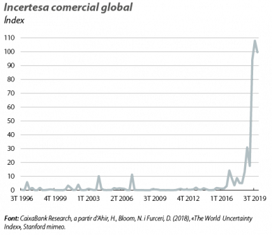Les tensions comercials es mantenen com el principal focus de risc per a l’economia global. D’una banda, els EUA i la Xina van anunciar un acord (dins el marc d’una primera fase de negociacions) que va suspendre l’augment aranzelari sobre les importacions xineses previst per al 15 d’octubre, tot i que els detalls d’aquest acord encara no han estat definits. Així i tot, malgrat aquest acord i malgrat la intenció de les dues parts de continuar negociant en una segona fase, la incertesa continuarà llastant el creixement econòmic en els propers trimestres (ja que les negociacions han patit més d’un vaivé en els últims trimestres i la confiança de les empreses i dels consumidors es restaurarà només de forma molt gradual). De l’altra, les tensions comercials entre els EUA i la UE es van intensificar després que l’Organització Mundial del Comerç (OMC) dictaminés que la UE havia atorgat ajudes il·legals a Airbus i autoritzés els EUA (com a compensació) a introduir aranzels per valor de 7.500 milions d’euros sobre un ventall de productes europeus (la major part agroalimentaris). Malgrat que aquests aranzels poden ser eliminats en qualsevol moment, la seva introducció (efectiva el 18 d’octubre) pot contribuir al deteriorament del sentiment econòmic.