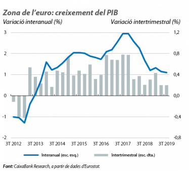 Mentrestant, l’activitat a la zona de l’euro aguanta el tipus. En particular, el creixement del PIB de la zona de l’euro es va mantenir estable en el 0,2% intertrimestral (l’1,1% interanual) en el 3T 2019, un ritme una mica per damunt de les nostres previsions i de les del consens d’analistes (el 0,1% intertrimestral). Així i tot, el creixement continua en cotes modestes, en especial per la feblesa de la indústria i del sector exterior (penalitzats per la desacceleració de l’economia mundial i per l’entorn d’incertesa global que han comportat, entre altres factors, les tensions comercials entre els EUA i la Xina i la incògnita del brexit), a més d’altres llastos idiosincràtics, com el shock sectorial a la indústria automobilística. Tots aquests elements afecten més Alemanya, país del qual encara no es coneix la dada de PIB del 3T. Dels països dels quals sí que coneixem les dades, van destacar en positiu França, on el creixement es va mantenir en el 0,3% intertrimestral en el 3T (l’1,3% interanual), i Espanya (el 0,4% intertrimestral). En canvi, l’economia italiana va mantenir la tònica de creixement baix dels últims trimestres (amb un avanç del 0,1% intertrimestral i del 0,3% interanual).