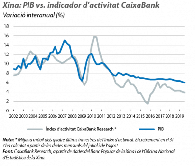 I, a la Xina, la desacceleració de l’economia no s’atura. En particular, el PIB de la Xina va avançar el 6,0% interanual en el 3T 2019, la qual cosa representa una desacceleració de 2 dècimes en relació amb el registre del 2T i el creixement més baix des que el país va començar a publicar dades de PIB trimestrals (el 1993). En part, aquesta desacceleració reflecteix la transició estructural de la Xina cap a una economia més terciaritzada, que comporta ritmes de creixement menys intensos. Però una part de la desacceleració dels últims trimestres també ha estat causada pel menor dinamisme del sector industrial i per l’elevada incertesa associada a la guerra comercial amb els EUA, que ha penalitzat les exportacions xineses. En els propers trimestres, preveiem que l’economia xinesa es continuarà alentint de manera gradual. No obstant això, les autoritats tenen encara marge per continuar estimulant l’economia, en especial mitjançant la política monetària, i per evitar una desacceleració abrupta.