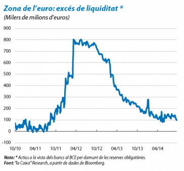L'evolució dels preus posa el BCE en alerta. Per bé que, al juny, la màxima autoritat monetària europea ja va anunciar un paquet de mesures acomodatícies, el deteriorament de les perspectives econòmiques que s'ha produït durant l'estiu l'ha forçat a fer un nou pas endavant. Així, al setembre, va anunciar un nou programa de compra d'actius de renda fixa privada. En concret, a partir de l'octubre, el BCE comprarà titulitzacions de crèdit i cèdules hipotecàries. S'espera que aquest nou paquet de mesures, juntament amb les subhastes de liquiditat a llarg termini (TLTRO) anunciades al juny, ajudi a consolidar la incipient millora del crèdit. No obstant això, encara queden per definir importants detalls d'aquest programa, com, per exemple, en quina mesura servirà perquè els bancs puguin transferir risc. Ara com ara, la primera subhasta de liquiditat condicionada al crèdit (TLTRO), que es va dur a terme al setembre, va tenir menys acollida del que havien anticipat els mercats (només es va col·locar el 21% de la liquiditat disponible). De tota manera, s'espera que la participació vagi a més en la segona subhasta del desembre, ja que ja s'hauran fet públics els resultats de les proves d'estrès que està duent a terme el BCE.