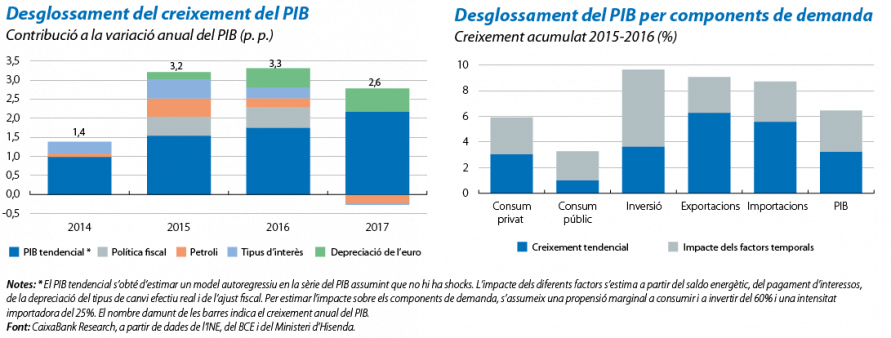 El creixement de l’economia espanyola va ser molt vigorós en el bienni 2015-2016: va superar el 3% en els dos anys i va batre els pronòstics de la majoria dels analistes. Aquest extraordinari èxit es conseqüència de la confluència d’uns factors de suport temporal, tant externs (el baix preu del petroli i la política monetària ultraexpansiva del BCE) com interns (impuls fiscal), que s’han sumat a la recuperació cíclica de l’economia. En el segon semestre del 2016, aquests vents de cua van començar a perdre intensitat, i això s’ha reflectit en un suau alentiment del ritme d’avanç del PIB. De cara al 2017, l’evolució d’aquests factors de suport determinarà, en gran part, el ritme d’avanç de l’economia espanyola l’any vinent.