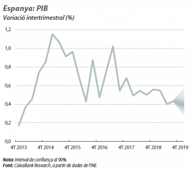 Espanya continua creixent per damunt dels seus veïns. L’economia espanyola es troba en un període de desacceleració que reflecteix la moderació pròpia d’una fase més madura del cicle (el 2019 es completarà el sisè any d’expansió) i l’impacte d’un entorn exterior menys favorable. Així, quan falta un mes per acabar l’any, tot fa pensar que el PIB creixerà l’1,9% el 2019, clarament per damunt de l’1,1% esperat per a la zona de l’euro. Aquest creixement és inferior a la mitjana del 2,7% dels anys 2014-2018, però, com s’argumenta a l’article «L’economia espanyola el 2020: no estem tan malament», del Dossier d’aquest mateix Informe Mensual, el risc de recessió és d’un contingut 15%. Així, de cara al 2020, s’espera que l’economia mantingui un creixement al voltant de l’1,5%, esperonada per la demanda domèstica i pel creixement de la renda disponible de les famílies. Així mateix, l’economia espanyola afronta aquesta desacceleració amb menys desequilibris macroeconòmics que en el passat. Així, segons les nostres previsions, la balança per compte corrent tancarà el 2019 amb un superàvit de l’1,6% del PIB, quan, el 2007, l’any previ a la Gran Recessió, presentava un dèficit del –9,4%; el deute de les llars se situa al voltant del 65% del PIB, quan, el 2007, s’acostava al 90%, i el de les societats no financeres se situa al voltant del 90%, quan, al final del 2007, superava el 120%. La competitivitat relativa de l’economia espanyola també ha millorat de manera dràstica des del 2007, i la pujada recent dels costos laborals està lluny de revertir aquesta tendència. En aquest sentit, el diferencial d’inflació amb la zona de l’euro el 2019 és negatiu, –0,4 p. p., mentre que, el 2007, els preus pujaven a Espanya 0,6 p. p. més que a la zona de l’euro. No obstant això, queden deures per fer. Entre ells, l’entorn exterior menys favorable resta un factor de suport a la millora de la posició inversora internacional neta (que ha passat del –97,8% del PIB en el 2T 2014 al –80,0% en el 2T 2019). De la mateixa manera, la correcció del deute públic, que ha avançat molt lentament en uns anys de fort creixement (el 97,8% del PIB en el 3T 2019, a la vora del màxim del 100,9% del 1T de 2015), comptarà amb vents de cua cíclics més fluixos.