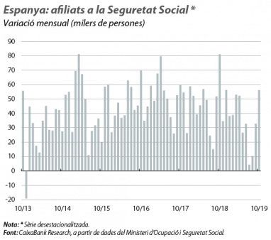 Desacceleració gradual al mercat laboral, coherent amb el menor creixement de l’economia. El nombre d’afiliats a la Seguretat Social va augmentar el 2,3% interanual a l’octubre (el 2,4% al setembre), la qual cosa representa un increment del nombre d’afiliats de 436.920 persones en els 12 últims mesos. En el mateix període, els aturats van disminuir en 77.044 persones. Per sectors, l’afiliació al sector de la indústria va registrar un ritme d’avanç moderat, de l’1,2% interanual, 1 dècima inferior a la registrada al setembre, i l’afiliació a la construcció va moderar el ritme de creixement fins al 3,7% interanual, 4 dècimes menys que al setembre. En canvi, l’afiliació als sectors de serveis i turisme va mantenir el ritme d’avanç, del 2,7% i del 2,8% interanual, respectivament.