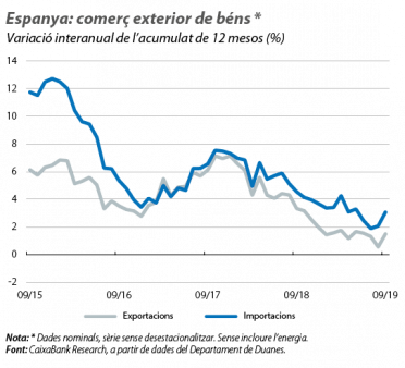 El deteriorament del superàvit exterior continua. Al setembre, el saldo comercial de béns va empitjorar a causa de la balança de béns no energètics. Així, el dèficit comercial es va situar en el 2,8% del PIB (acumulat de 12 mesos). Això representa un deteriorament de 0,29 p. p. en relació amb un any abans, atribuïble íntegrament a l’empitjorament de la balança de béns no energètics. En concret, les exportacions no energètiques van avançar molt per sota de les importacions no energètiques (l’1,5% interanual en l’acumulat de 12 mesos, en relació amb el 3,1%).