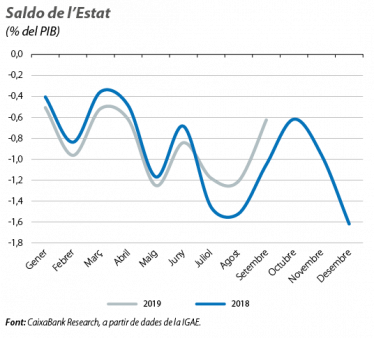 L’execució pressupostària mostra poc avanç en la consolidació dels comptes públics. Així, a l’agost del 2019, el dèficit de les Administracions públiques (excloses les corporacions locals) va ser lleugerament superior al registre de l’agost del 2018 i es va situar en el 2,1% del PIB (+0,1 p. p.). Aquest resultat va ser degut, principalment, al deteriorament dels comptes de la Seguretat Social i de les comunitats autònomes, que van experimentar dèficits del 0,5% i del 0,2% del PIB, respectivament. Per la seva banda, el dèficit de l’Estat, del qual ja es disposen dades fins al setembre, es va situar en el 0,6% del PIB, per sota de l’1,1% registrat al setembre del 2018. Això apunta a una lleugera millora en l’execució pressupostària al final de l’any, tot i que aquesta reducció no seria suficient per compensar el desfasament de la Seguretat Social i de les comunitats autònomes en relació amb l’objectiu de dèficit per al conjunt de les Administracions públiques per al 2019 (el 2,0%). Aquest objectiu està inclòs de nou en l’actualització dels comptes públics que el Govern va remetre a Brussel·les a l’octubre. Aquest Pla Pressupostari inclou un escenari inercial per al 2020, sense mesures d’ingressos addicionals previstes i només amb l’augment de les pensions (el +0,9%) i del salari dels funcionaris (el +2,0%) com a mesures de despesa addicionals incloses el 2020. Per a enguany, el Govern preveu un dèficit de l’1,7%, 3 dècimes per sota de les previsions de CaixaBank Research.