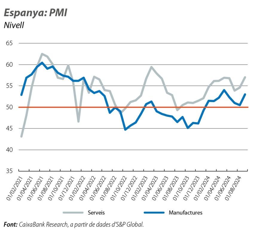 Amb les dades disponibles fins a la tercera setmana de setembre, l’indicador de consum de CaixaBank Research constata una millora del consum de les llars del 4,0% interanual (el 3,5% en el 2T), gràcies a l’augment de 7 dècimes del consum presencial, fins a l’1,8%. L’avanç del consum s’aprecia, sobretot, en la despesa en béns de primera necessitat (el 5,6% interanual vs. el 5,0% en el 2T), mentre que la despesa en transports i a les benzineres es va moderar amb força (el 0,5% interanual vs. el 5,1% en el 2T), en línia amb les caigudes en el preu de la benzina. Pel costat de l’oferta, l’índex PMI del sector manufacturer reverteix tres mesos de caigudes i, al setembre, va pujar fins als 53 punts, el registre més alt des del maig. De la mateixa manera, l’índex PMI del sector serveis va repuntar amb força i es va situar en 57 punts, la millor dada des de l’abril del 2023.