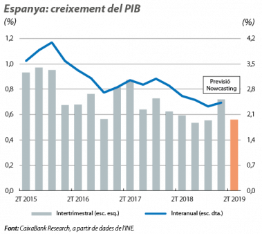 L’activitat manté un bon ritme de creixement. En l’entorn exterior més advers que es descriu en la conjuntura d’economia internacional d’aquest mateix Informe Mensual, els indicadors mostren que l’economia espanyola trampeja millor que els seus socis europeus la desacceleració de l’economia global. En concret, després de créixer un sòlid 0,7% intertrimestral (el 2,4% interanual) en el 1T 2019, el model de previsió a curt termini del PIB de CaixaBank Research apunta a un avanç del 0,6% intertrimestral en el 2T (la primera estimació del PIB es coneixerà el 31 de juliol). Aquest ritme de creixement reflecteix l’elevada generació d’ocupació, la millora de la confiança dels consumidors i el bon ritme d’avanç de les xifres de negocis del sector serveis (el +5,4% interanual a l’abril, mitjana mòbil de tres mesos) i del sector industrial (el +2,4% interanual). A més a més, la producció industrial va rebotar, a l’abril, amb un avanç de l’1,7% (al març havia caigut el 3,0%, arrossegada pel sector de l’energia, especialment volàtil). A l’altre plat de la balança, s’ha produït un cert afebliment de la confiança empresarial (al maig, els PMI de manufactures i de serveis van disminuir en 1,7 i en 0,3 punts, fins als 50,1 i els 52,8 punts, respectivament) i del sector exterior, però, ara com ara, això no impedeix que les taxes de creixement es mantinguin en cotes considerables. D’aquesta manera, malgrat que el creixement continua en una senda de moderació cap a nivells més coherents amb el potencial econòmic, i, per tant, més sostenibles, Espanya es manté com un dels països amb millor ritme de creixement de la zona de l’euro, empesa, en especial, per la contribució de la demanda interna i de la inversió. Així ho reflecteixen també les últimes previsions macroeconòmiques del BCE, que, en el desglossament per països, apunten que el PIB d’Espanya creixerà el 2,4% en el conjunt del 2019, una xifra coherent amb l’escenari de CaixaBank Research (previsió del 2,3%).