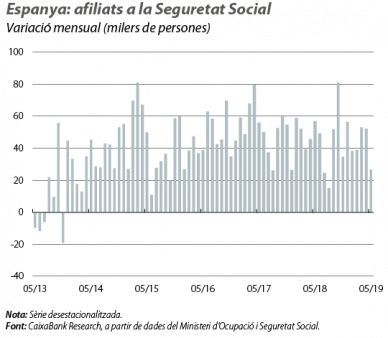 El mercat laboral avança amb dinamisme. El creixement de l’ocupació va ser del 2,8% interanual al maig (dades desestacionalitzades), percentatge que representa un bon ritme de creació d’ocupació, tot i que lleugerament inferior al 3,0% registrat a l’abril (una moderació que, d’altra banda, és coherent amb la senda cap a un creixement més suau de l’activitat comentada més amunt). Així, el nombre total d’afiliats a la Seguretat Social es va situar en 19.442.113 persones, una xifra molt propera al màxim històric assolit al juliol del 2007. Per sectors, va destacar l’augment de l’afiliació als serveis, en especial als turístics (el +3,4%). Per la seva banda, l’última enquesta trimestral de cost laboral mostra que, en el primer trimestre, el cost laboral per hora efectiva va augmentar el 2,4% interanual, de manera que va registrar una acceleració de +0,5 p. p. en relació amb el segon semestre del 2018, la qual s’explica, en part, per l’increment de les cotitzacions socials al començament d’enguany (augment del salari mínim interprofessional i eliminació del topall de les cotitzacions màximes). A més a més, aquesta evolució dels costos laborals és coherent amb les pujades salarials pactades als convenis col·lectius (el 2,2% de mitjana del gener al maig).