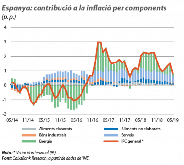 La inflació continua molt continguda i, al juny, es va moderar fins al 0,4% (el 0,8% al maig). Tot i que encara no es coneix el desglossament per components, la disminució del preu dels carburants suggereix que el component energètic explicaria la major part de la moderació. Per la seva banda, la inflació subjacent es va situar en el 0,7% al maig (encara no es coneix la dada del juny), amb una desacceleració de 0,2 p. p. en relació amb l’abril, la qual s’explica, en part, per la caiguda dels preus dels paquets turístics i per l’efecte calendari de la Setmana Santa.