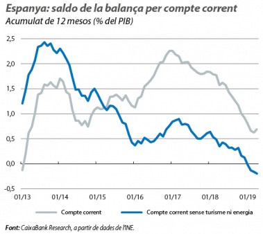 Respir al deteriorament del compte corrent. El saldo per compte corrent va millorar fins al 0,7% del PIB a l’abril (acumulat de 12 mesos), en relació amb el 0,6% del març. No obstant això, en relació amb l’abril del 2018, aquest registre representa una reducció del superàvit de 0,9 p. p. Aquest deteriorament és atribuïble, principalment, al saldo de béns no energètics (0,4 p. p.), a la balança de serveis (0,3 p. p.) i, en menor mesura, al saldo energètic (0,2 p. p.). Per la seva banda, la posició inversora internacional neta es va situar en el –77,7% del PIB en el 1T 2019, percentatge que representa un lleuger deteriorament en relació amb el trimestre anterior. Així i tot, en els 12 últims mesos, la millora ha estat substancial (de 6,1 p. p.), en bona part gràcies als canvis de valoració dels instruments de la cartera de deute.