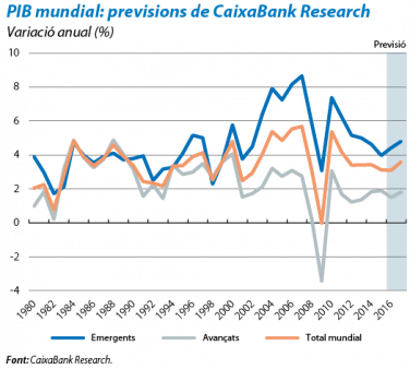 El creixement del 2016 serà similar al del 2015. Malgrat que, en essència, la tònica prevista a mitjà termini no varia (és a dir, l’economia mundial s’accelerarà el 2017 i el 2018), l’evolució a curt termini és una mica més continguda del que s’havia previst. Es tracta, fonamentalment, del reflex d’una evolució de l’economia nord-americana lleugerament més feble del que s’havia previst. Així i tot, cal recordar que una part del menor dinamisme relatiu dels EUA serà compensada pel millor to que exhibeixen les economies europees. Per la seva banda, el grup d’emergents tendeix a anar recuperant posicions, tot i que les economies exportadores de primeres matèries són penalitzades per un escenari de preus més advers del que s’havia considerat inicialment (i, en alguns casos, per xocs d’incertesa de caràcter polític).