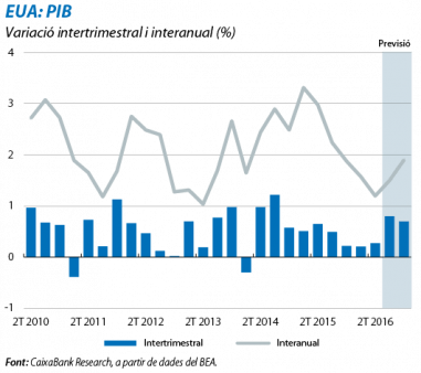 Un final d’any una mica menys expansiu. A mesura que es disposa d’indicadors del 3T 2016, es posa de manifest que el pols econòmic nord-americà és moderadament més baix del que s’havia previst. Es tracta de xifres que no qüestionen que, en aquest trimestre i en el 4T, el ritme d’avanç intertrimestral del PIB serà millor que el registrat en el primer semestre del 2016. Però, certament, l’acceleració no serà tan intensa com s’havia anticipat. Conseqüentment, la previsió de CaixaBank Research per al 2016 passa de l’1,7% a l’1,5% i la del 2017, del 2,2% al 2,1%. El 2018, el creixement serà del 2,0%. Pel que fa a la visió a més llarg termini, des de CaixaBank Research s’apunta que el creixement es mantindrà una mica per damunt del 2% anual.