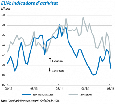 L’activitat industrial i la de serveis mostren la faceta feble de la conjuntura. Els indicadors d’activitat manufacturera i els del sector terciari reflecteixen amb claredat el to més contingut de l’evolució cíclica dels EUA. Així, a l’agost, l’indicador ISM d’activitat manufacturera es va situar per sota dels 50 punts, la qual cosa indicaria una contracció de l’activitat. No obstant això, en el conjunt del trimestre, aquesta dada queda matisada pels registres del juny i del juliol, que van ser sensiblement millors. Un diagnòstic similar es pot extreure de l’evolució de l’indicador ISM de l’activitat dels serveis: caiguda a l’agost (en aquest cas encara per damunt del llindar dels 50 punts), que és compensada per uns registres dinàmics en els dos mesos precedents. Per la seva banda, el sector immobiliari, tot i que continua avançant, es mostra també menys vigorós del que s’esperava, com ho sembla confirmar que, a l’agost, es van iniciar només el 0,9% més d’habitatges que un any abans.