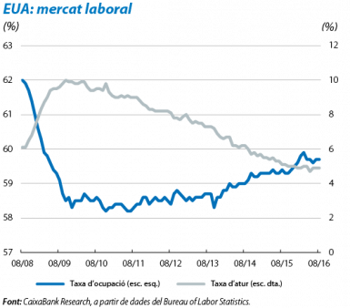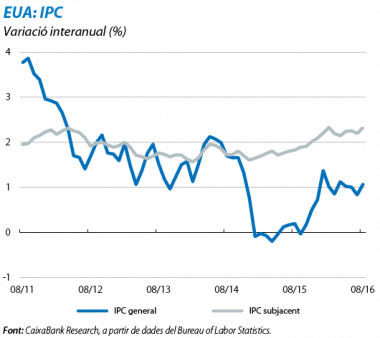 A l’avantsala d’un avanç apreciable de la inflació. A l’agost, la inflació es va situar en l’1,1% interanual, 3 dècimes per damunt del registre del mes anterior. De cara als propers mesos, s’espera un augment notable de la inflació: si es compleixen les previsions, se situarà en el 2,3% interanual al març del 2017. Pel que fa a la inflació subjacent, es va situar 1 dècima per damunt del registre del mes anterior, en el 2,3%. El mercat de treball, per la seva banda, es continua mostrant robust. A l’agost, es van crear 155.000 llocs de treball, una dada significativa, i més si es té en compte la revisió a l’alça en el registre del juliol (fins als 275.000). La taxa d’atur es va mantenir en un reduït 4,9%, i els salaris van continuar marcant avanços apreciables (el 2,4% interanual).
