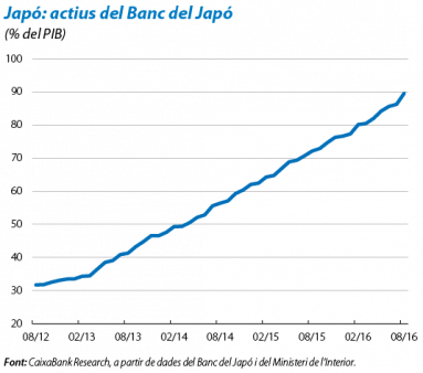 La política monetària arriba al seu límit? La revisió del PIB del 2T 2016 ha situat el creixement en el 0,2% intertrimestral, enfront del 0,05% de la primera estimació. Així i tot, les fràgils dades d’activitat i la deflació persistent (l’IPC sense aliments de l’agost, referència del Banc del Japó, va caure el 0,5% interanual) confirmen que el creixement nominal japonès encara té molt marge per recuperar-se. En aquest context, el Banc del Japó ha optat per una modificació relativament menor de l’estratègia de política monetària. Lluny de centrar-se en objectius de caràcter general i més ambiciosos, l’entitat reconeixia que la rendibilitat del sector financer és penalitzada per una corba de tipus en negatiu i molt plana. En conseqüència, va anunciar que reajustarà les compres de bons per aconseguir que la corba de tipus tingui més pendent, de manera que no llasti tant el sector financer.