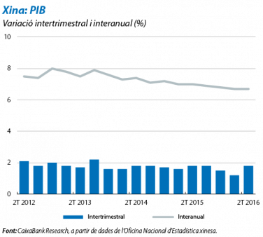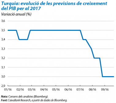 Turquia accelera, però les perspectives no són esperançadores. En el 2T 2016, el PIB va créixer el 3,1% interanual (el 0,3% intertrimestral), enfront del 4,7% interanual anterior i lluny del 5,7% del 4T 2015. L’alentiment va ser atenuat pel fort impuls del consum públic (avanç interanual del 15,9% en l’esmentat 2T). A curt termini, la combinació de momentum intern (emparat, en especial, per la despesa pública) i d’unes condicions financeres internacionals acomodatícies suggereix que l’economia mantindrà un vigor apreciable fins al final d’enguany. Malgrat tot, de cara al 2017, les perspectives es tornen més negatives. Així, l’entorn financer internacional serà, presumiblement, més advers a partir del moment en què la Fed endureixi la política monetària, al mateix temps que cal esperar un ritme d’avanç del consum públic més contingut. Si a aquests factors s’afegeix el manteniment de la incertesa política (precisament, els principals motius adduïts per Moody’s per rebaixar la qualificació creditícia del deute sobirà per sota del grau d’inversió són de caràcter institucional), els dubtes s’intensifiquen.