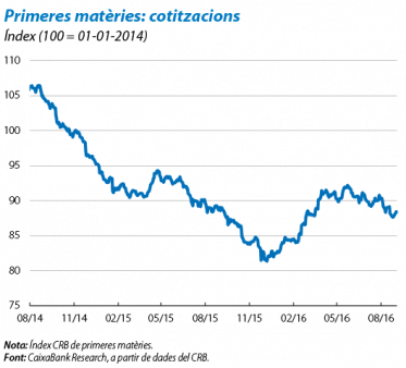 Primeres matèries: canvi d’escenari del petroli. Al setembre, les primeres matèries han tendit a oscil·lar sense una tendència definida, de manera que l’indicador CRB, representatiu del conjunt de primeres matèries, va tancar el mes en nivells gairebé idèntics als de l’inici de l’any. Tenint en compte que aquesta és l’evolució conjunta, destaca la tendència a la baixa de les primeres matèries agrícoles. Així i tot, el gran protagonista ha estat el petroli. El 28 de setembre, després de diversos intents infructuosos, l’OPEP va plantejar un ajust de producció que sembla creïble: reducció d’uns 700.000 barrils diaris de producció el 2017 i deixar Iran, Nigèria i Líbia fora del límit extractiu. En resposta a l’acord, el petroli de qualitat Brent va passar dels 46 als 49 dòlars per barril, una tendència que confirma l’escenari de CaixaBank Research de recuperació del petroli durant la resta de l’any. No obstant això, les elevades existències, la resistència del shale i el menor creixement de la demanda esperada suggereixen que, a mitjà termini, la velocitat a la qual es recuperarà serà més lenta del que s’havia previst.