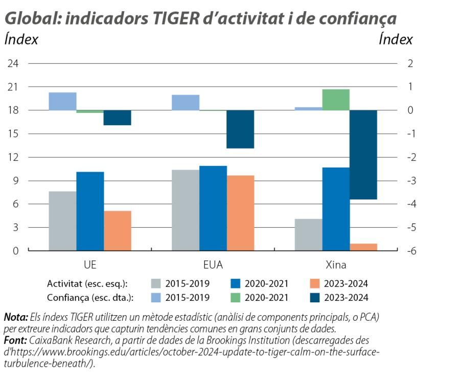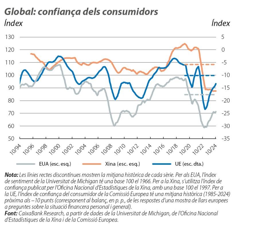 En un entorn de risc geopolític elevat i d’incertesa sobre el rumb de la política econòmica a nivell global, la confiança continua sent el taló d’Aquil·les de les economies més grans. Tot i que, en els casos de l’economia europea i de la Xina, el deteriorament dels indicadors de confiança s’observa en un entorn de refredament de l’activitat econòmica, el cas dels EUA ofereix un exemple clar de com la (falta de) confiança, a nivell global, pot tenir una arrel més fonamental –i, eventualment, frenar l’economia– mentre el risc percebut i la incertesa romanguin en nivells elevats. Així mateix, l’Informe Global d’Estabilitat Financera de l’FMI va assenyalar l’entorn d’elevada incertesa com un risc addicional per a l’estabilitat macrofinancera, ja que pot retardar decisions de consum i d’inversió. En aquest sentit, als EUA, l’indicador de confiança publicat per la Universitat de Michigan mostra una millora en els últims mesos i s’ha situat en els 70,5 punts a l’octubre, encara molt per sota de la seva mitjana històrica (pròxima als 85 punts). En el cas de la Xina, la confiança dels consumidors es manté a la vora dels mínims històrics (en els 85 punts, en relació amb una mitjana històrica de 108 punts). A la zona de l’euro, l’índex de confiança dels consumidors s’ha situat en els –11,2 punts a l’octubre i ha confirmat la tendència de millora dels mesos anteriors, però es manté encara per sota de la mitjana històrica (pròxima als –10 punts). Per la seva banda, l’indicador de sentiment ESI, publicat per la Comissió Europea, va tornar a caure a l’octubre (fins als 95,6 punts) i es manté també per sota de la mitjana històrica des del juliol del 2022.