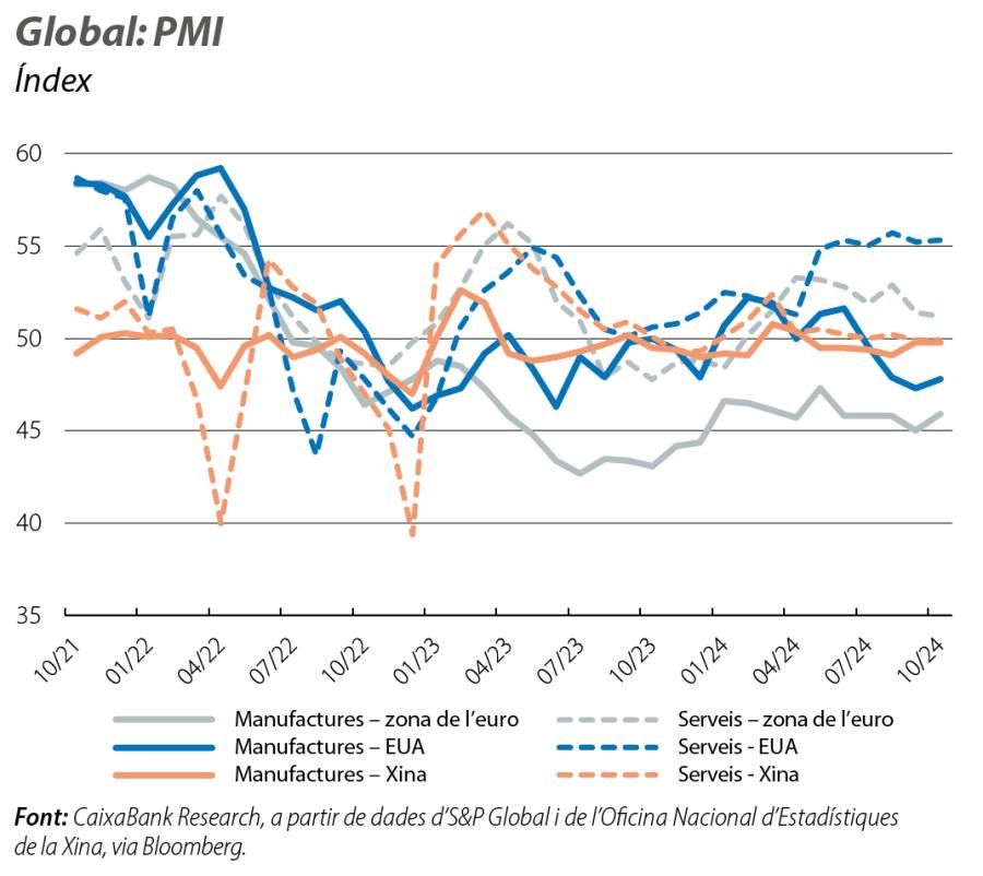 Al començament del 4T, els indicadors de sentiment empresarial continuen reflectint una disparitat clara entre la zona de l’euro i els EUA, i la feblesa del sector manufacturer global en relació amb un sector serveis més resilient. Així, el PMI compost de l’octubre per a la zona de l’euro es va situar en els 50,0 punts (49,6 al setembre) i apunta a un estancament de l’activitat. Als EUA, l’índex compost va pujar fins als 54,3 punts (54,0 al setembre), en terreny expansiu i oferint un senyal més del dinamisme de l’economia nord-americana. A les dues bandes de l’Atlàntic, el sector manufacturer continua en un moment d’atonia. A la zona de l’euro, el PMI manufacturer va arribar als 46,0 punts a l’octubre (45,0 anterior), mentre que les manufactures nord-americanes, malgrat alguna millora (47,8 vs. 47,3), tampoc no s’acosten al terreny del creixement. Pel que fa als serveis, continuen en zona expansiva, tot i que, a la zona de l’euro, han perdut embranzida (51,6 vs. 51,4), i, als EUA, l’índex continua mostrant una major vitalitat (55,3 vs. 55,2).