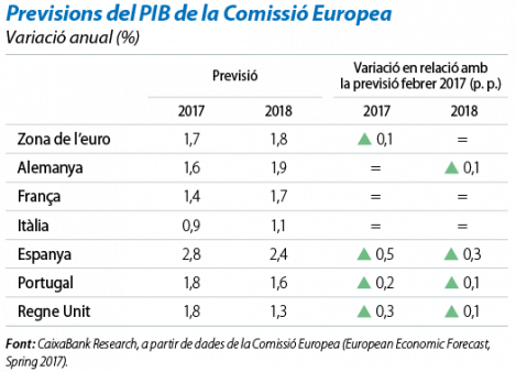 La recuperació guanya tracció i la incertesa es modera. Després de les revisions a l’alça del creixement de la zona de l’euro dutes a terme pel Banc Central Europeu (BCE), al març, i pel Fons Monetari Internacional, a l’abril, al maig la Comissió Europea també ha millorat les perspectives de la zona de l’euro i espera un avanç de l’activitat de l’1,7% el 2017 i de l’1,8% el 2018. Aquest encadenament de revisions a l’alça reflecteix la reducció dels riscos negatius al voltant de l’economia de la zona de l’euro (en especial, els d’origen domèstic) i la consolidació de la millora dels indicadors de sentiment econòmic, que, des del final del 2016, se situen, de manera sostinguda, en màxims dels últims anys. En aquesta mateixa línia, des de CaixaBank Research, també hem millorat les perspectives de l’activitat de la zona de l’euro fins a l’1,9% el 2017 i l’1,8% el 2018, amb una revisió a l’alça generalitzada entre països i amb el suport de la solidesa de la demanda domèstica, de la recuperació gradual del mercat laboral i d’unes condicions financeres acomodatícies. No obstant això, com va comentar la Comissió en l’actualització del seu escenari, l’economia europea continua operant en un entorn d’incertesa i de riscos globals importants. A més a més, existeixen llastos que impedeixen una acceleració del creixement a mitjà termini, com l’elevat endeutament i el baix creixement de la productivitat. En aquest sentit, una de les tasques pendents continua sent aprofundir en la integració europea, un procés que podria rebre una embranzida renovada del nou president francès, l’europeista Emmanuel Macron, que va sortir elegit en la segona volta de les eleccions presidencials amb més del 60% dels vots.