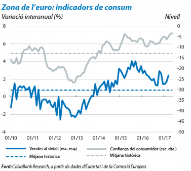 El consum de les famílies dóna suport a l’avanç de l’economia. Les vendes al detall de la zona de l’euro van augmentar el 2,4% interanual al març i van tancar el 1T amb una acceleració en relació amb els registres del gener i del febrer. Per la seva banda, l’índex de confiança del consumidor per al conjunt de la zona de l’euro manté la dinàmica de millora observada des de mitjan 2016 i, al maig, es va situar en els –3,3 punts, lleugerament per damunt del registre de l’abril i en un nivell màxim des de l’any 2007. El bon to del consum privat es basa en unes condicions financeres acomodatícies, afavorides, a curt termini, per la política monetària expansiva del BCE i per la millora del mercat laboral com a factor a mitjà termini (a l’abril, la taxa d’atur es va situar en el 9,3%, la més baixa des del març del 2009).