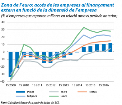 Les condicions financeres acomodatícies faciliten l’accés al crèdit a les empreses. Segons ho recull l’última enquesta d’accés al finançament extern per part de les empreses, recopilada pel BCE, entre l’octubre del 2016 i el març del 2017, la demanda de crèdit de les pimes va augmentar de forma moderada al conjunt de la zona de l’euro. A l’enquesta, les pimes assenyalen que aquest augment de les necessitats de finançament extern va anar acompanyat d’una major disponibilitat de crèdit bancari i d’uns tipus d’interès més baixos. En aquesta línia, a l’enquesta, les pimes indiquen que la disponibilitat de finançament extern no és una de les principals preocupacions a les quals s’enfronten. Això reflecteix tant la consolidació de la recuperació, que millora les perspectives econòmiques de les empreses i la seva solvència, com la transmissió de la política monetària expansiva del BCE, que es tradueix en unes condicions financeres acomodatícies que donen suport a la recuperació de la zona de l’euro.